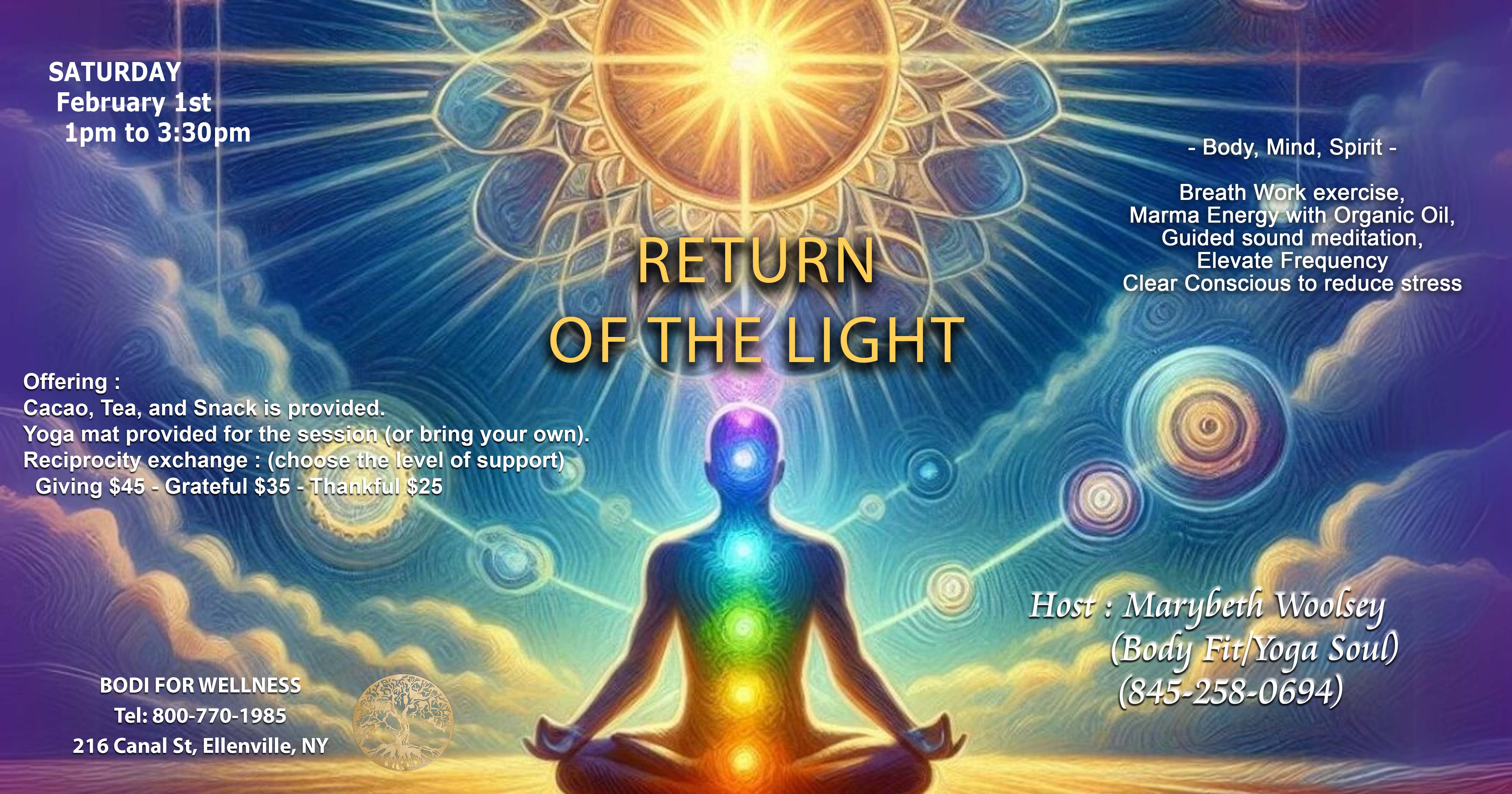 RETURN OF THE LIGHT Body, Mind, Spirit Breath Work, Marma Energy, Flow Prana Guided sound meditation, Clear Conscious.
